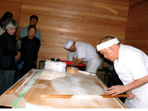 名人の神業的そば打ちを熱心に見ていただいた後は、そば好きの定番“盛りそば”に舌鼓…。